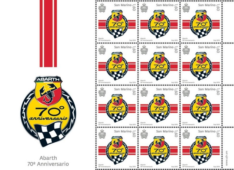 Abarth świętuje swoje 70-lecie i właśnie z tej okazji został wydany specjalny znaczek pocztowy, upamiętniający tę rocznicę. Za projekt odpowiada Biuro Numizmatyczne w San Marino. Znaczek został wydrukowany w nakładzie 60 000 egzemplarzy, a każdy ma wartość 1,60 euro. Pieczęć jest przedmiotem kolekcjonerskim, przedstawiającym godło Skorpiona i flagę z szachownicą …