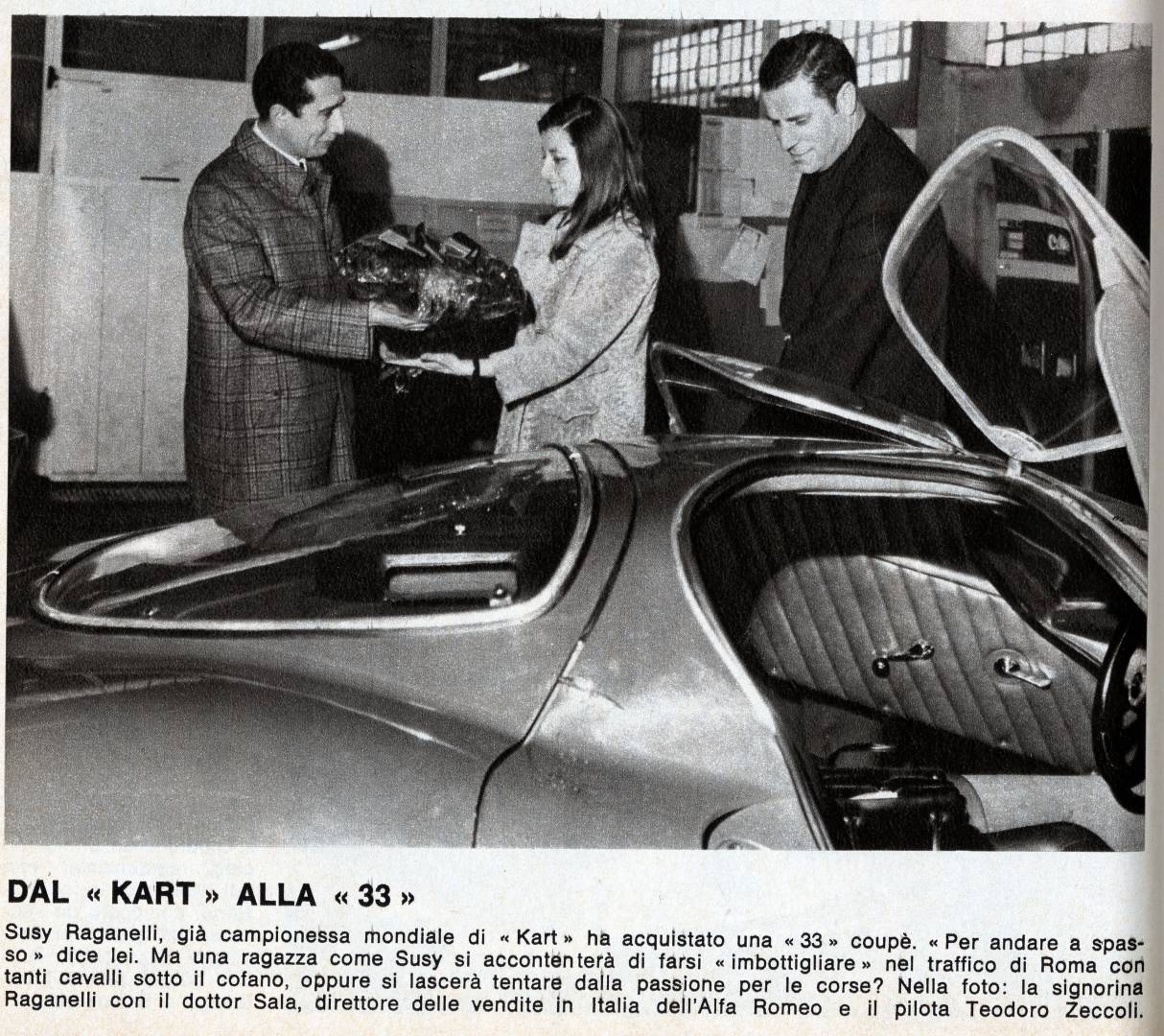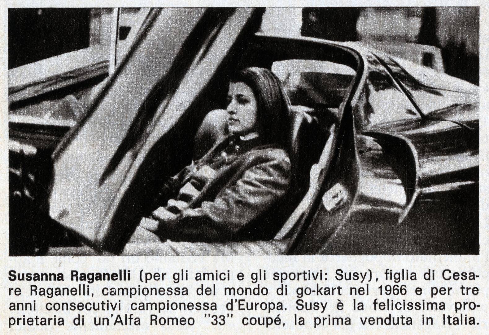 Susanna „Susy” Raganelli w 1966 roku wygrała Kartingowe Mistrzostwa Świata w klasie 100 cm³. Była mocno związana z Alfą Romeo startując do końca swojej kariery modelem GTA. Zasłynęła również jako pierwsza włoska właścicielka jednego z zaledwie 12 wyprodukowanych egzemplarzy Alfy Romeo 33 Stradale z 1967 roku.