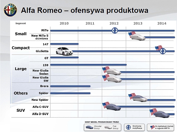 Owocem "małżeństwa" Fiata i Chryslera będą dwa auta klasy SUV. W 2012 zadebiutuje pierwszy SUV Alfy Romeo w segmencie C, czyli konkurent np. Audi Q5. Dwa lata później AR pojawi się wśród większych SUV-ów takich jak Jeep Grand Cherokee, zresztą najpewniej włoski odpowiednik będzie korzystał z rozwiązań stosowanych przez Jeepa… Cóż, taki los 🙂