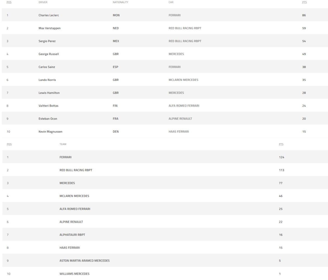 Ostateczny wynik na mecie niedzielnego wyścigu oznaczał, że Scuderia Ferrari opuści Imolę z liczbą ledwie 20 punktów – większość z nich (12) zdobyto w sobotnim sprincie. Charles Leclerc w niedzielę tuż przed końcem wyścigu zbyt mocno najechał na szykanę, w efekcie jego bolid podbiło i doszło do potężnej destabilizacji. Monakijski kierowca stracił panowanie i uderzył w bandę doznając znaczących uszkodzeń przedniego skrzydła. Zamiast walki o 2. lokatę dojechał do mety 6.