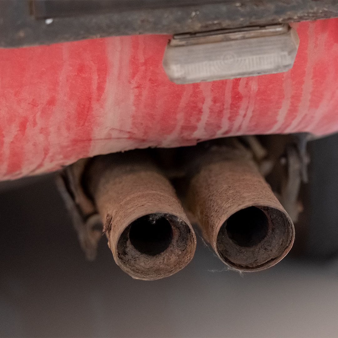Ręcznie formowane panele nadwozia ze stopu są połączone z pleksiglasowymi osłonami ikonicznych reflektorów Daytony – choć jeden z nich jest pęknięty. W oczy rzucają się zardzewiałe elementy, w tym końcówki układu wydechowego, wgniecenia na bocznych progach, warstwy kurzu i zabrudzone szyby.