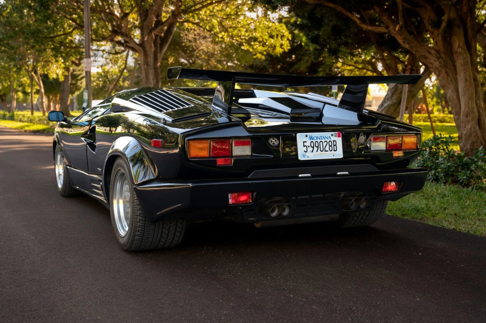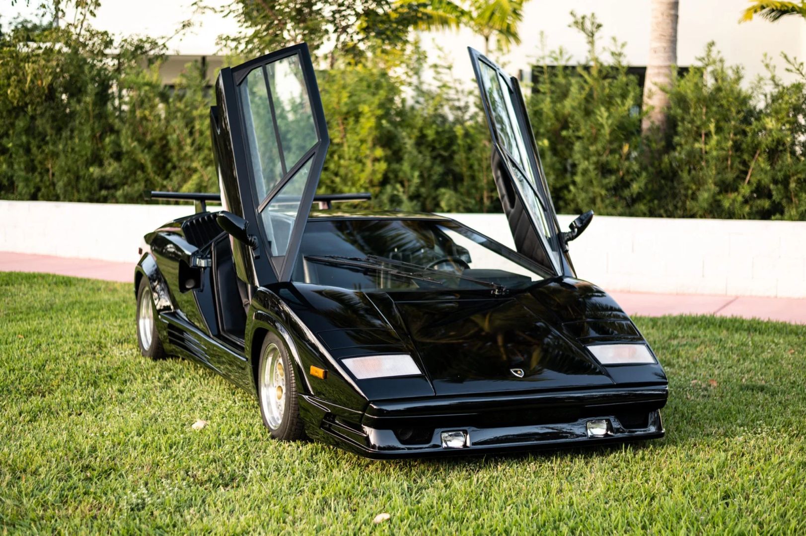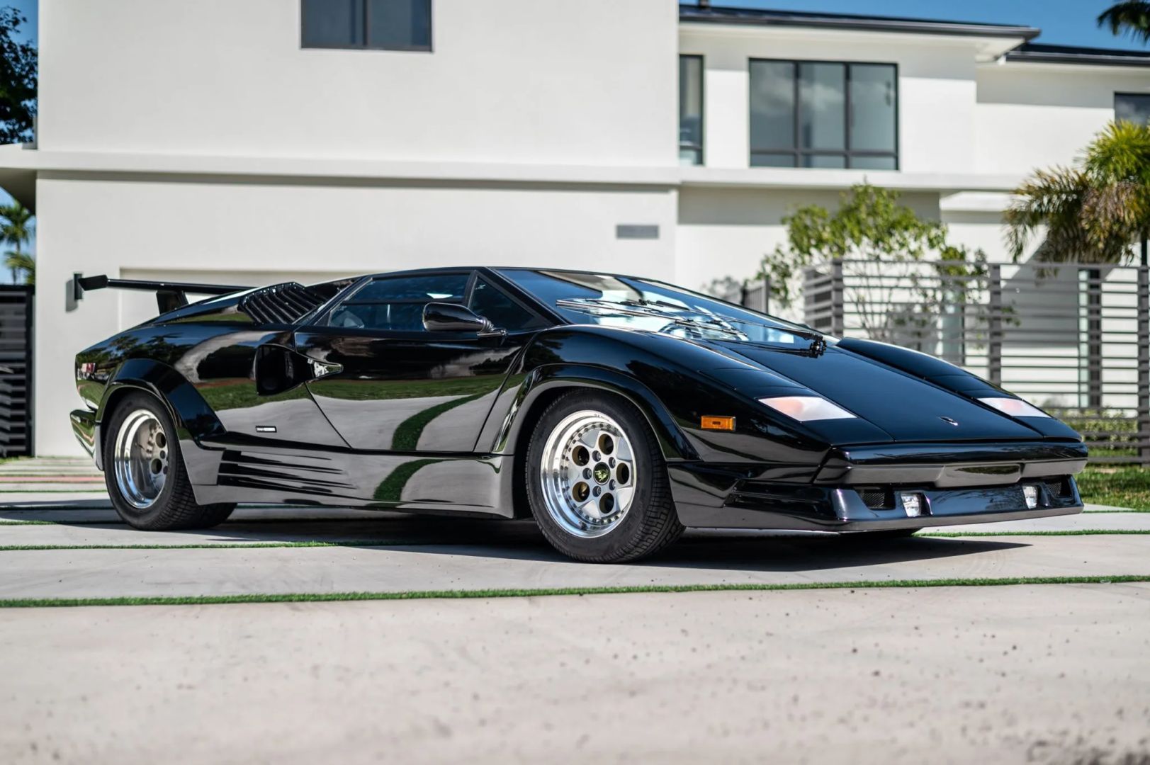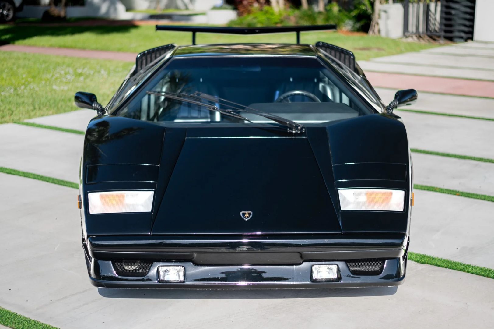 Nadwozie zdobi czarny lakier, a samochód został wyposażony w europejski przedni zderzak i potężne tylne skrzydło, które pomogło uczynić Countacha tak sławnym. Standardowe 15-calowe koła OZ Racing zachowały się i są owinięte w opony Pirelli P Zero Asimmetrico o wymiarach 225/50 z przodu i 345/35 z tyłu. W liście zaznaczono, że pompa hamulcowa została wymieniona w grudniu 2022 roku, przy okazji odbudowano zaciski hamulcowe.
