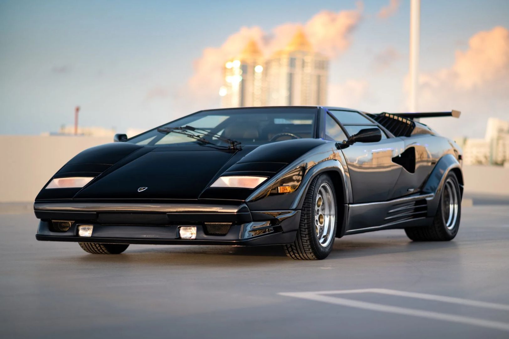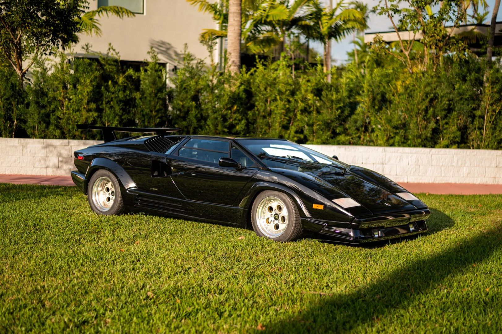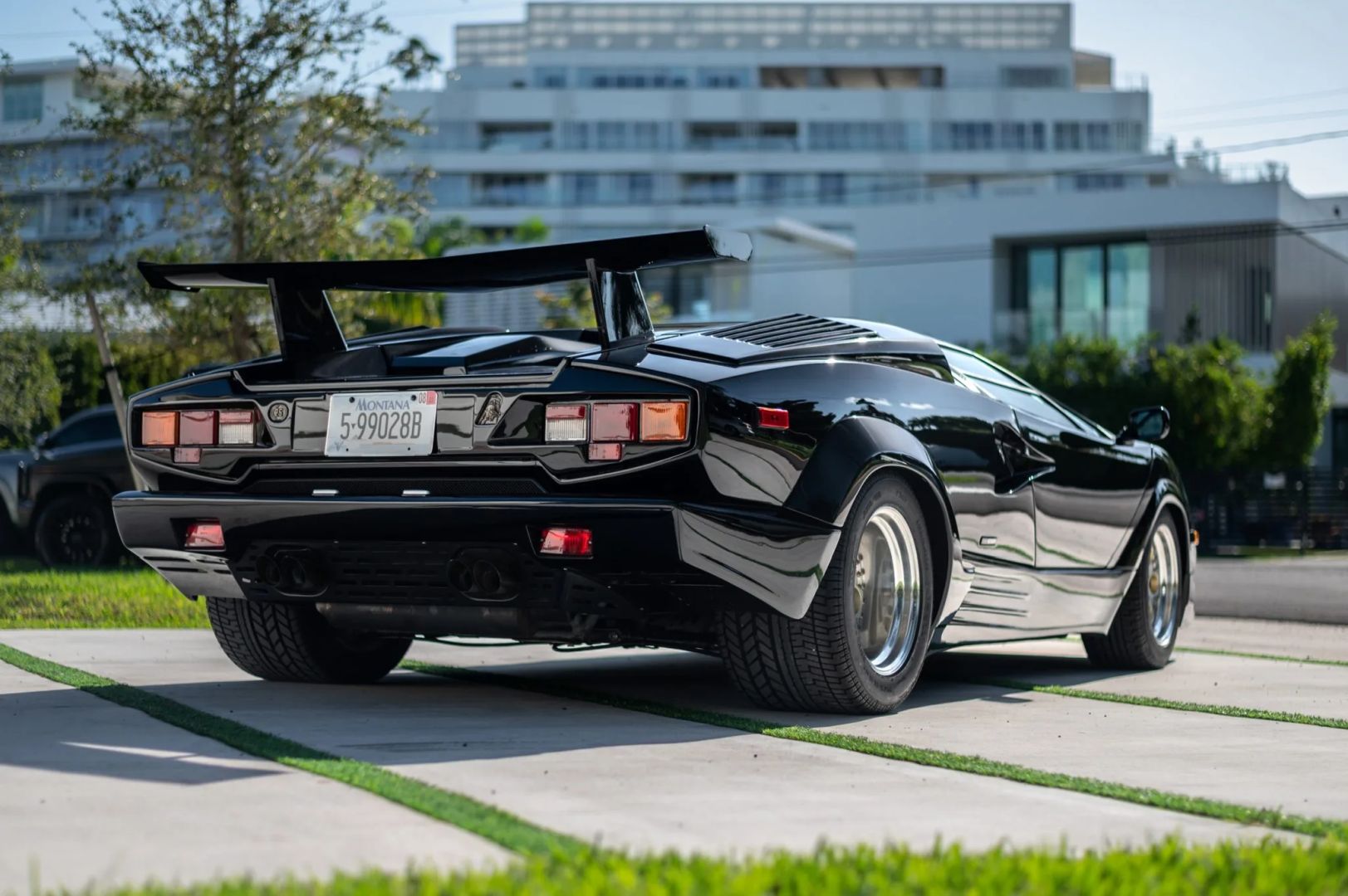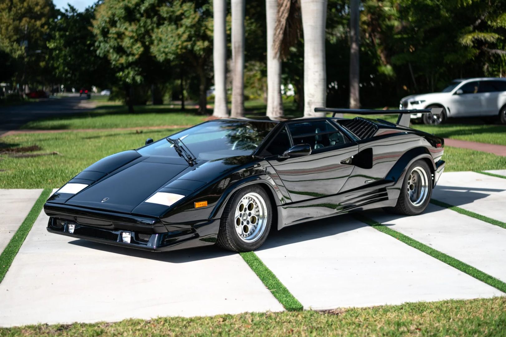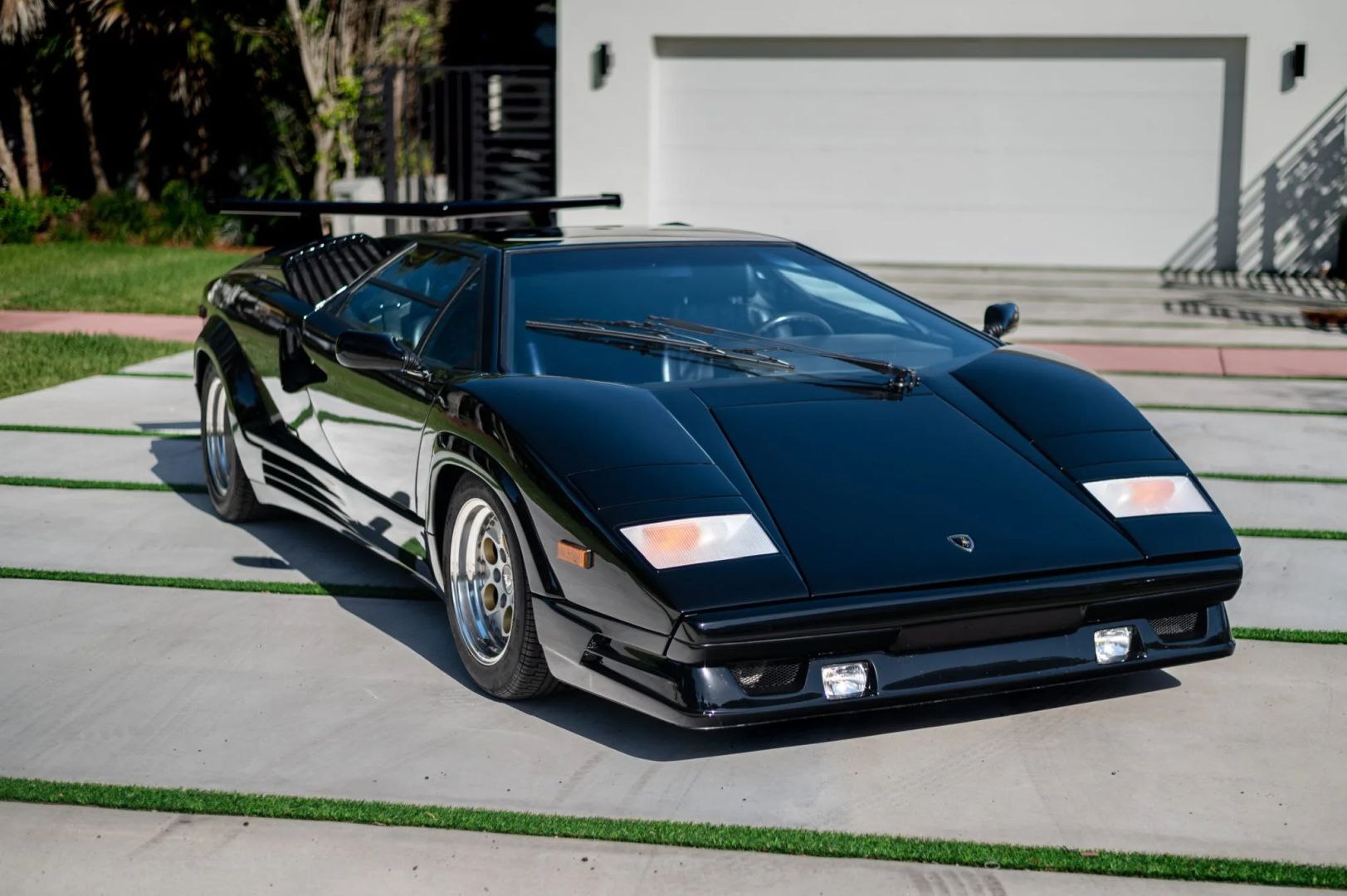 Nadwozie zdobi czarny lakier, a samochód został wyposażony w europejski przedni zderzak i potężne tylne skrzydło, które pomogło uczynić Countacha tak sławnym. Standardowe 15-calowe koła OZ Racing zachowały się i są owinięte w opony Pirelli P Zero Asimmetrico o wymiarach 225/50 z przodu i 345/35 z tyłu. W liście zaznaczono, że pompa hamulcowa została wymieniona w grudniu 2022 roku, przy okazji odbudowano zaciski hamulcowe.