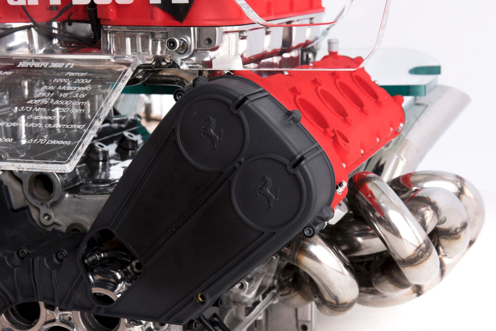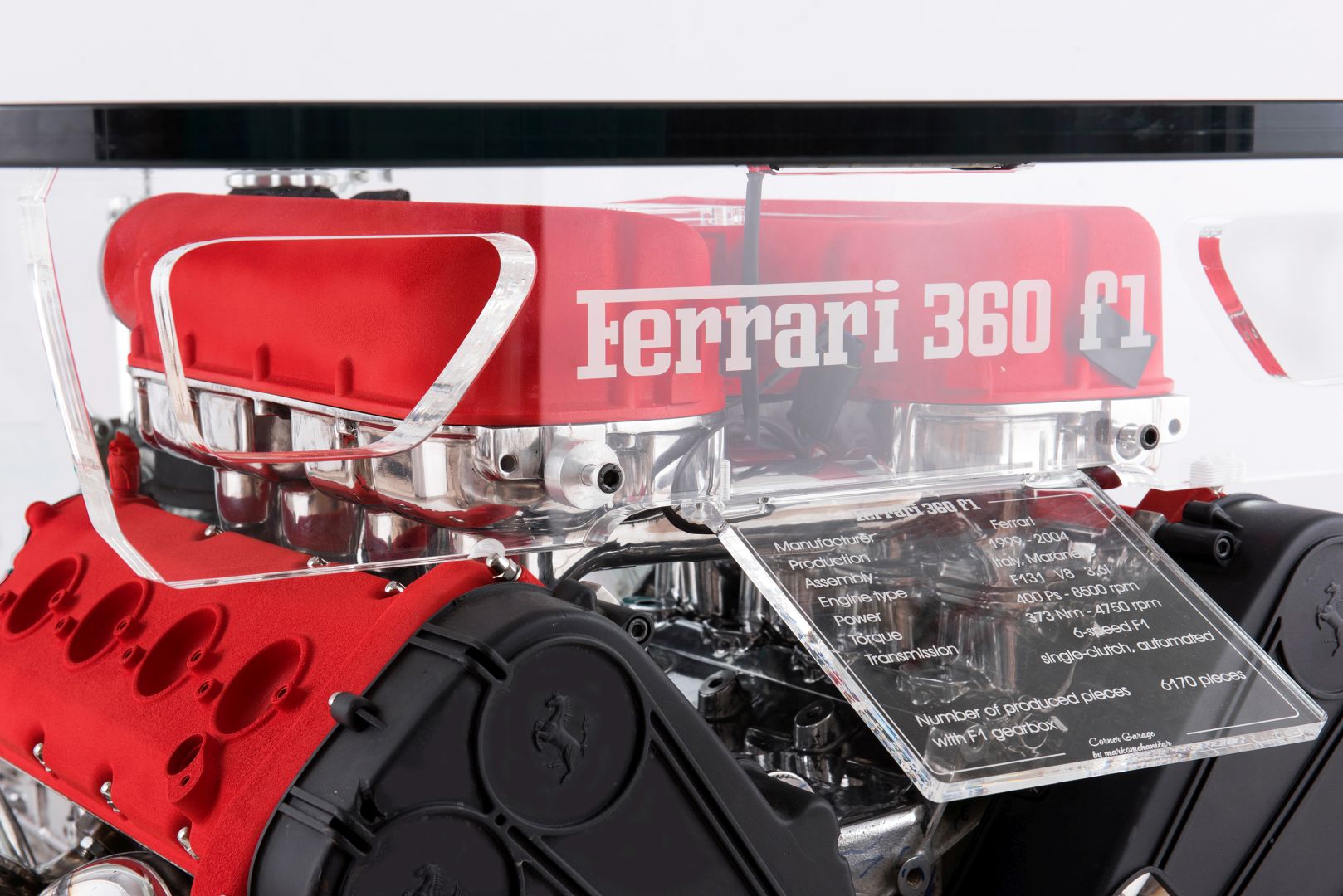 Na silniku widnieje numer 56611 potwierdzający jego autentyczność. Całość zdobią czerwone kolektory dolotowe i pokrywy zaworów, a także charakterystyczne logo Prancing Horse. Stolik posiada wbudowany system LED sterowany pilotem, który pozwala na zmianę koloru podświetlenia. Zainstalowana tabliczka informacyjna zawiera szczegółowe dane techniczne jednostki napędowej.